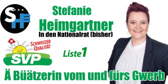 Jul142023Kanton AargauSchweiz / Suisse / Svizzera / SvizraHeimgartner Stefanie – 5400 Baden Ä Büätzerin vom und fürs Gwerb Ich kandidiere für den Nationalrat, bitte 2x auf Ihre Liste SVP Liste 1