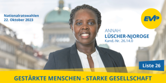 Okt22023Kanton Bern / BerneSchweiz / Suisse / Svizzera / SvizraLüscher Annah – 3018 Bern GESTÄRKTE MENSCHEN – STARKE GESELLSCHAFT Ich kandidiere für den Nationalrat, bitte 2x auf Ihre Liste EVP Liste 26